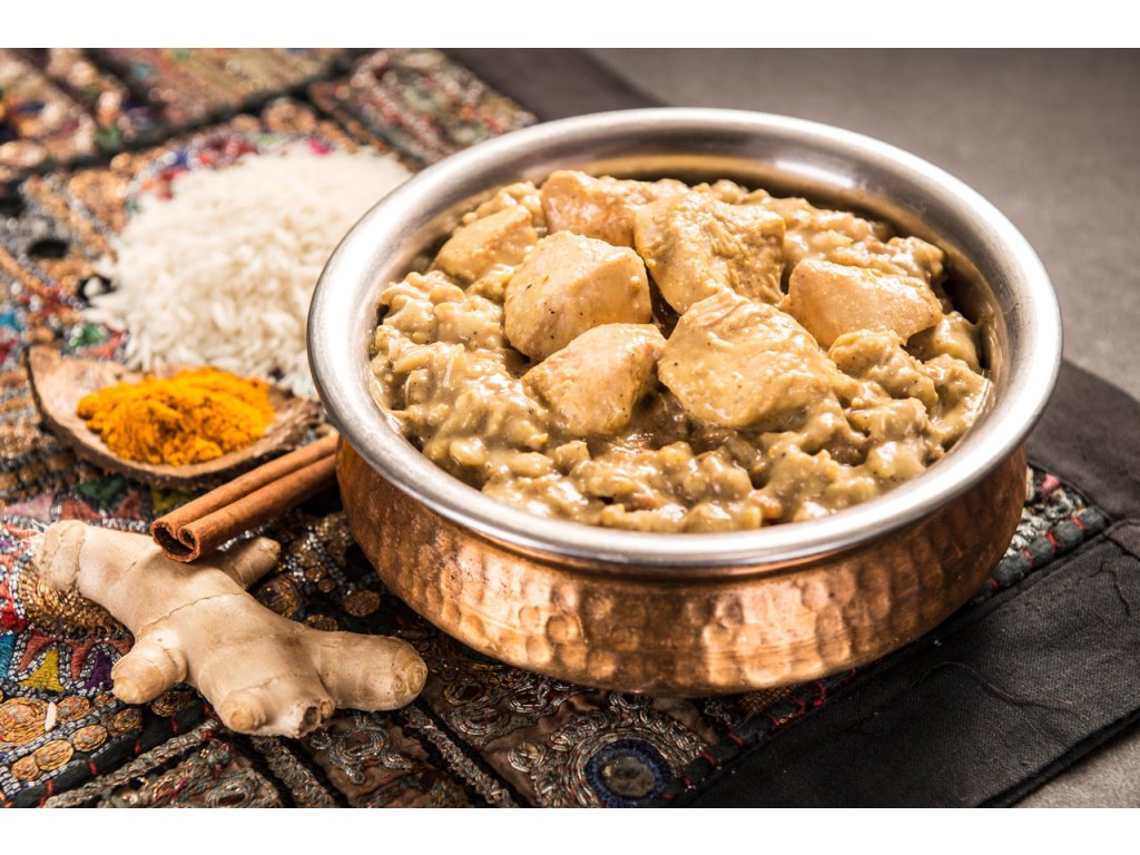 Chicken Korma with rice 400 g: chicken breast (30%), natural rice (12%), cream, onion, coconut milk (coconut extract (75%), drinking water), rice flour, corn flour, grated coconut, canola oil, salt, sugar, garam masala (coriander, pepper, cumin, cinnamon, lemon peel, cloves, cardamom, mace), cumin, cinnamon, cayenne pepper, turmeric, garlic, lemon, dried ginger, pepper.