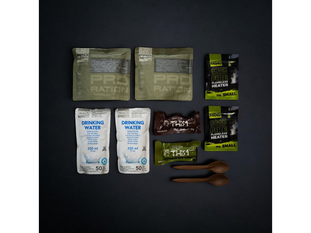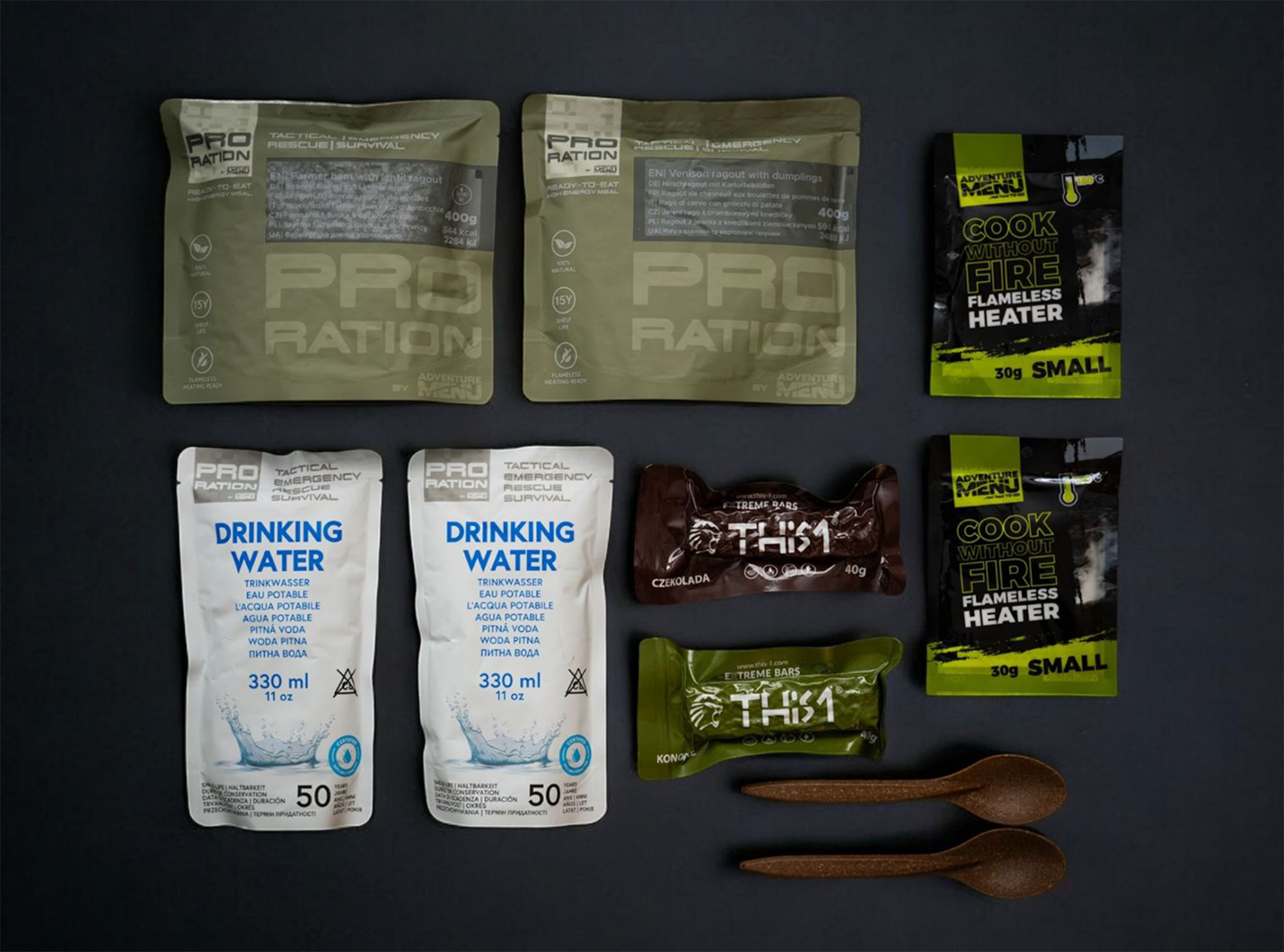 A practical food and water pack with a 15-year shelf life for meals and up to 50 years for water. Perfect as an emergency supply for your car, evacuation bag, or home preparedness kit — for individuals or smaller households. Includes two hearty meals, high-energy bars, drinking water, and a self-heating system.