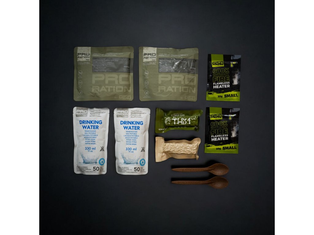 A practical food and water pack with a 15-year shelf life for meals and up to 50 years for water. Perfect as an emergency supply for your car, evacuation bag, or home preparedness kit — for individuals or smaller households. Includes two hearty meals, high-energy bars, drinking water, and a self-heating system.
