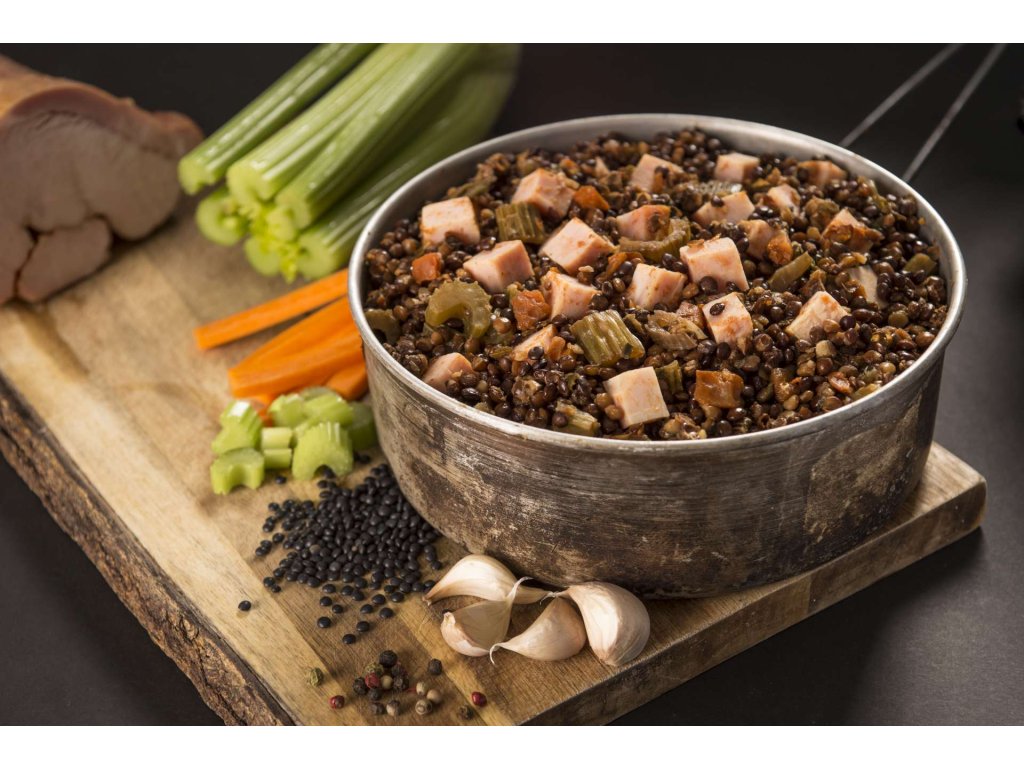Farmer ham with lentil ragout 400 g: black Beluga lentils (23%), ham (20%, pork (min. 98%), water, salt with iodine, flavour, spice extract), leek, carrot, celery, balsamic vinegar (fermented grape vinegar, concentrated grape must, contains SO2), canola oil, garlic, salt, pepper.