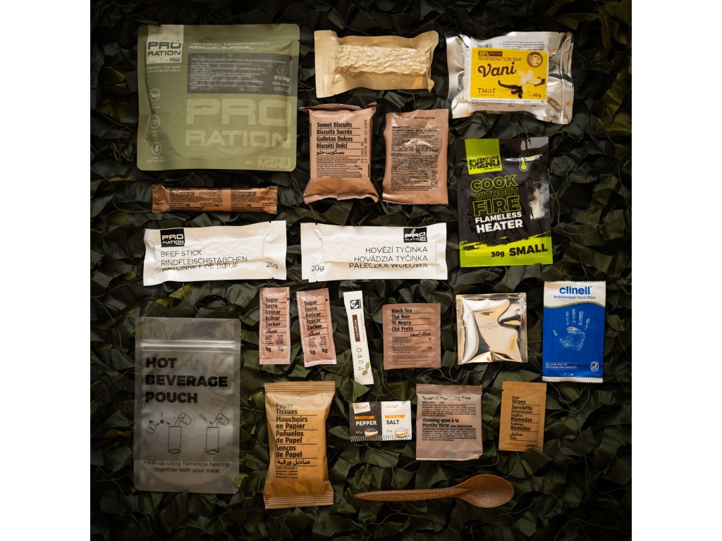A tactical food ration for half a day. It includes one main meal, a varied selection of energy and protein bars, sweet and salty snacks for quick energy, plus coffee, tea, and other practical essentials. Ideal for shorter missions, field duty, or as part of your gear.